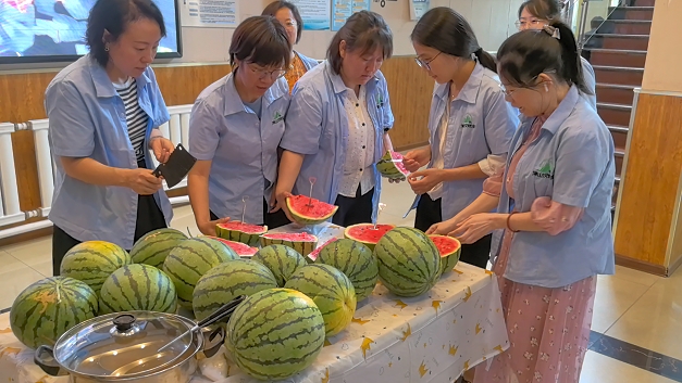 公楼一楼大厅变身清凉补给站:洗净的西瓜被均匀切开,每一半都插着贴心的铲形勺子——无需繁琐,拿起即可享用那甜脆多汁的凉爽,解渴更解暑!