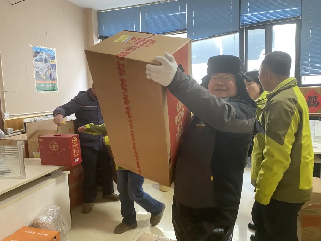 发放现场气氛热烈,大家忙工作的同时按序领取,喜悦之情溢于言表。沉甸甸的礼盒拿在手里,暖在心头。对于常年奔波在物流一线的津山汉人来说,公司